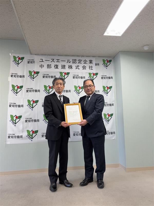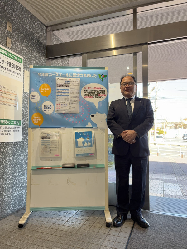 2月26日に厚生労働省・都道府県労働局の認定制度である「ユースエール認定」に新規認定され、3月12日に筒井社長が愛知労働局・名古屋東公共職業安定所長から認証書の授与を受けました。